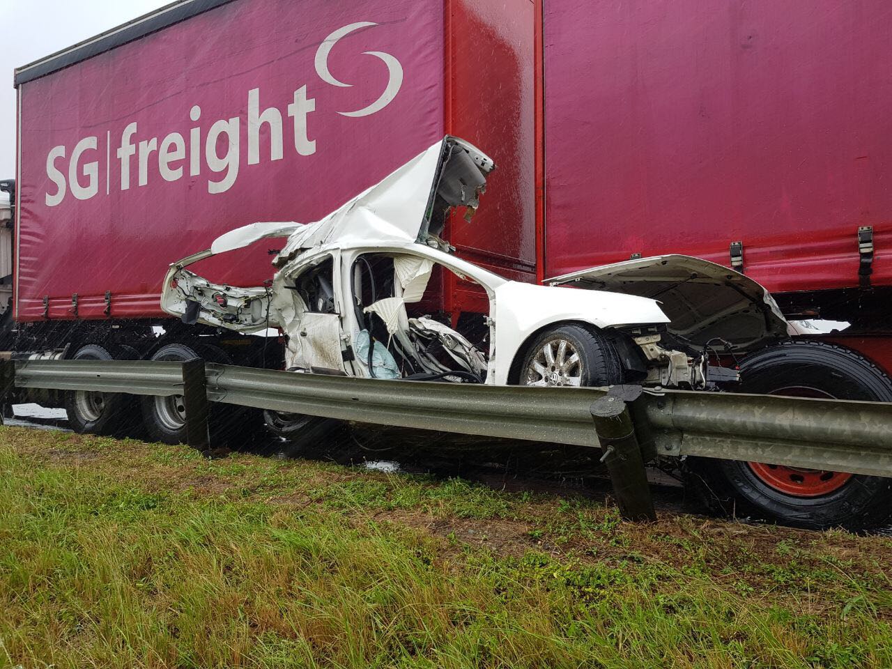 The driver of the white VW Golf is said to have lost control of his vehicle in the inclement weather, and collided head on with a truck