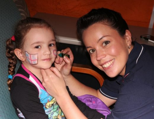 Ruth Classen has her face painted in NSRI colours by Charné Skiba
