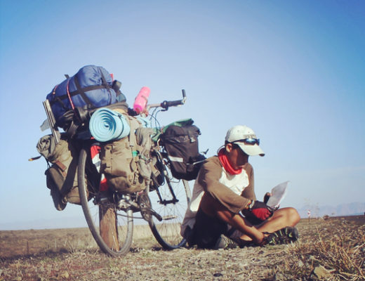 His bicycle carries a massive load, which includes a bag with clothes, water bottles, a tool kit, inflatable torch, a sleeping bag and a tent, which he pitches up when fatigue or night time sets in.