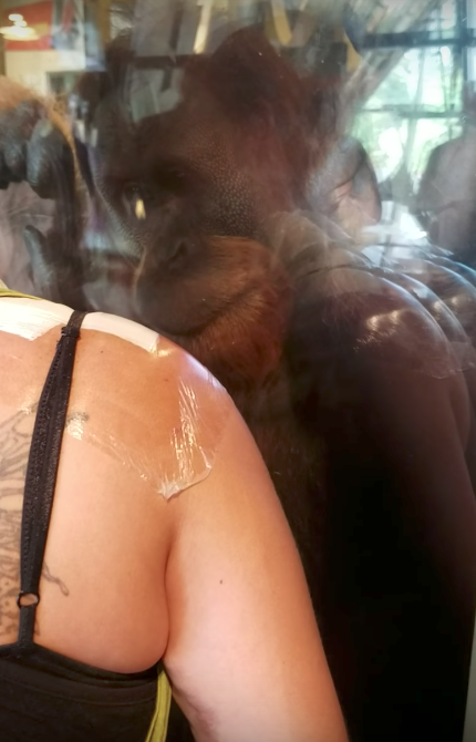 When the couple approached the orangutan area, Rocky, one of the resident primates, came up to her and, from his side of the glass, signalled curiously at her right shoulder and arm.