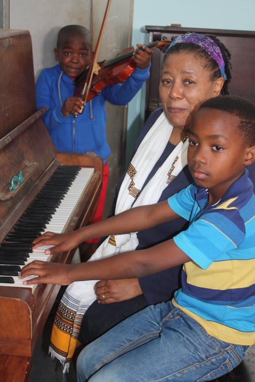 Ayabonga Sibiya playing violin while CEO Sibongile Khumalo shows Mrothe Mthembu how to play the piano