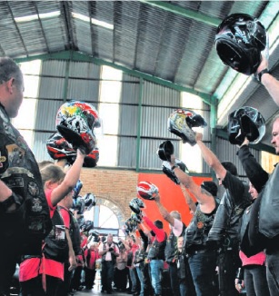 Fellow bikers raise their helmets in respect