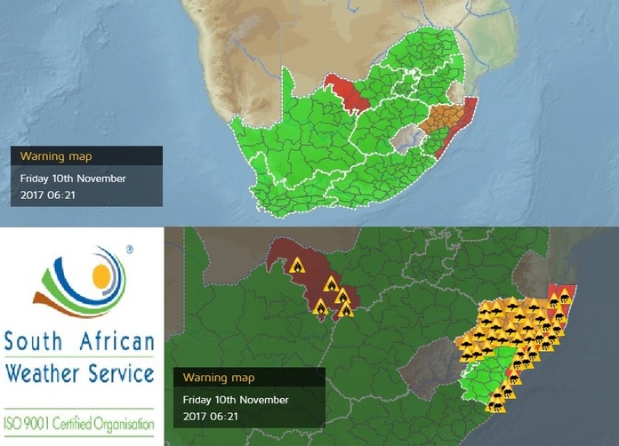 Meanwhile a weather warning of severe thunderstorms, with possible hail and strong winds, was also issued and is expected for north-western KZN (uThukela, Amajuba, Zululand and uMzinyathi) from 1pm to 9pm this evening.