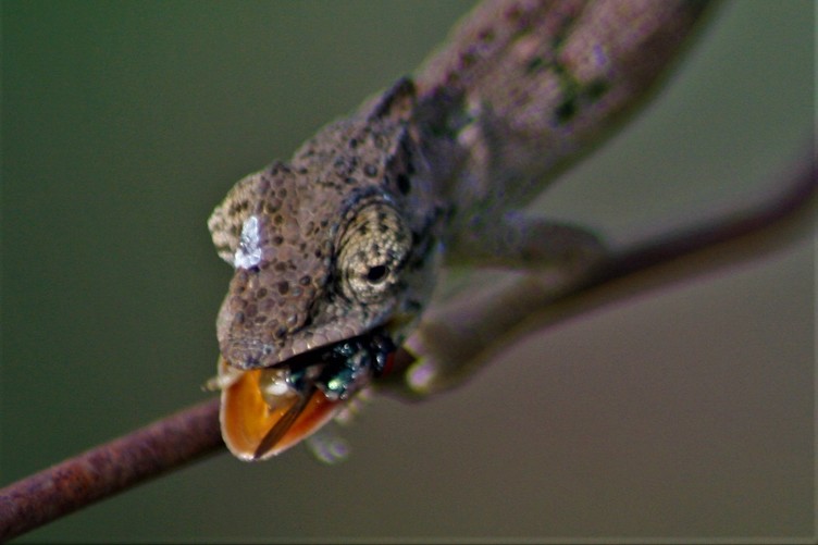 In South Africa, the flap-necked chameleon (Chamaeleo dilepis) has a lightning fast tongue which it uses to catch mostly insects.