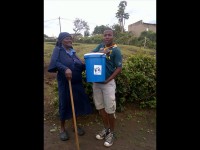 Dice representative Cebo Mnguni hands over a bucket to a Ngwelezane gogo