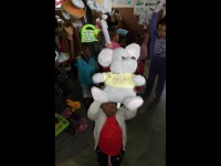 Toys given as presents to little girls and boys at the crèches included dolls and cars, teddy bears and sweets.