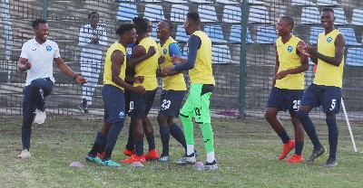 Mike Gumede gets a roaring reception from the bench players after scoring NRB’s third goal to seal the deal for a fine home win