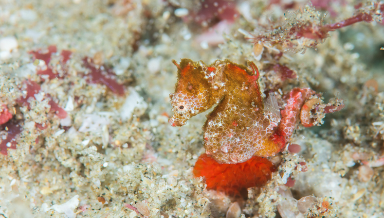 Unlike other pygmy seahorses, however, the local species was found living in turf-like algae, amid boulders and sand.