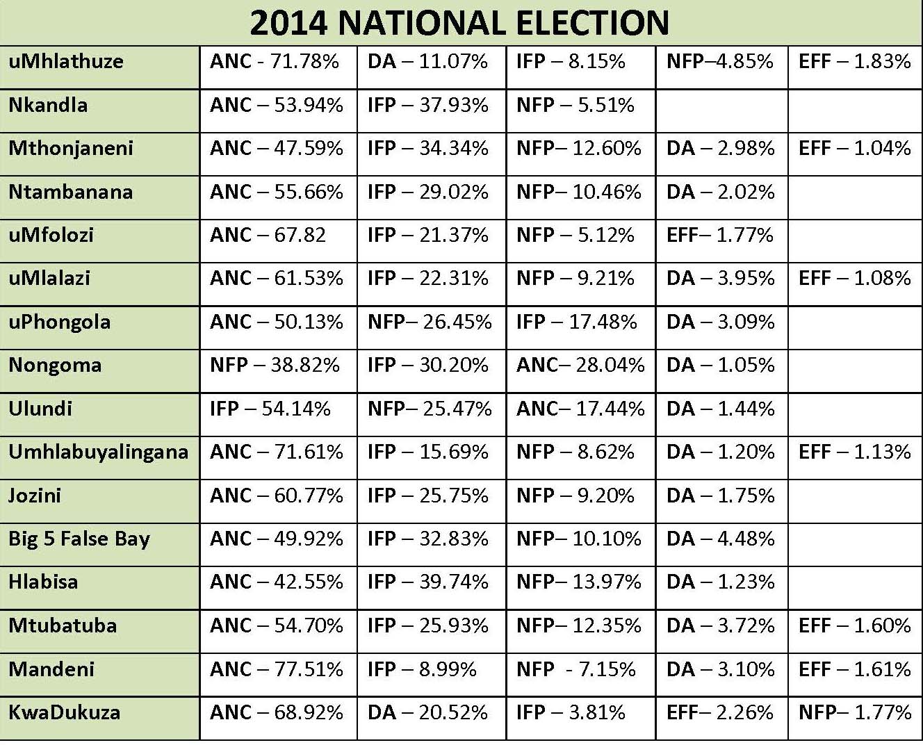 Eroding support in previous Inkatha Freedom Party (IFP) strongholds, the ANC was able to turn matters around in three municipalities where the IFP held power in the 2009 national elections – Ntambanana, Hlabisa and The Big 5 False Bay municipalities.