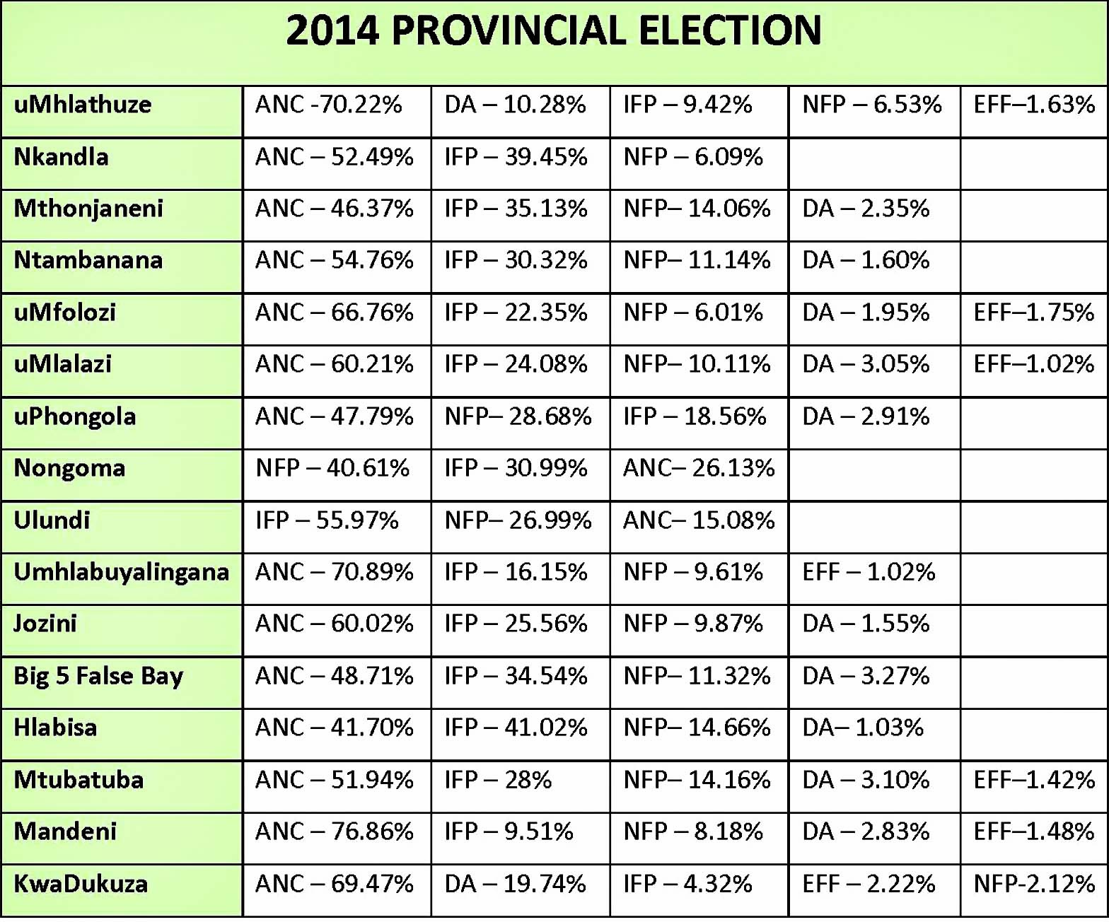 Final results streaming in to the IEC offices throughout the northern KZN region showed that the ruling party secured the largest piece of the vote pie for the national and provincial ballots in 14 of Zululand’s 16 municipalities.