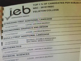 He obtained A’s in Afrikaans, engineering graphics and design, English, information technology, life orientation, advanced placement maths, maths and physical science, and registered an overall average of 92%.