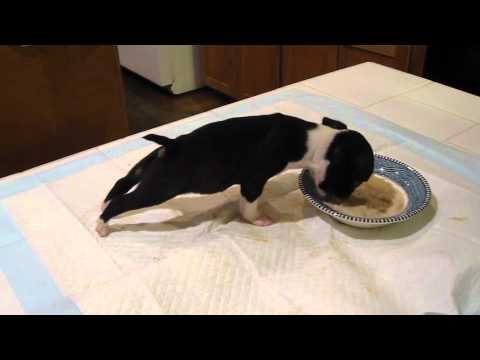 Boston Terrier pup enjoys his meal so much that he flips over it.