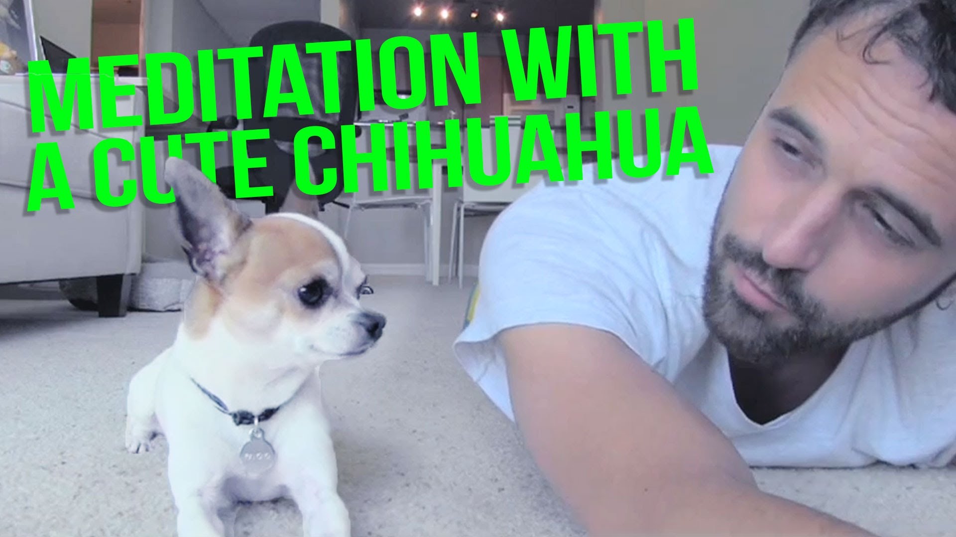 In this video Nic and Pancho meditate together. The small dog get relaxed with his owner voice and falls asleep!