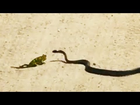 Snake finds chameleon on the road